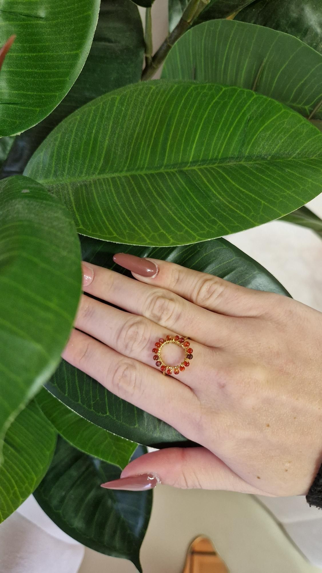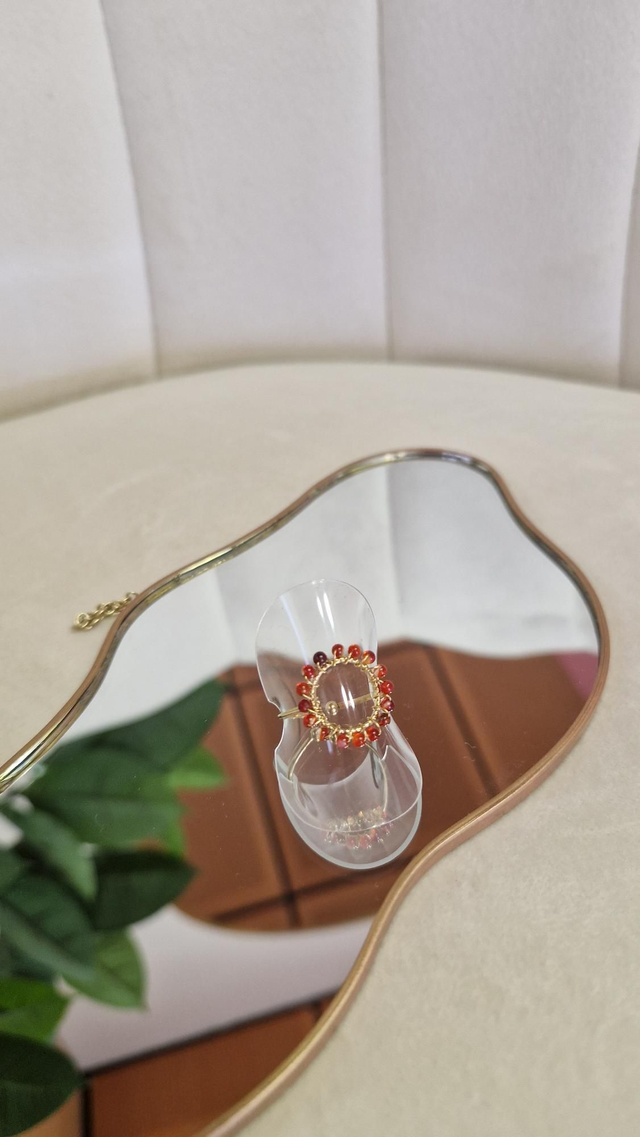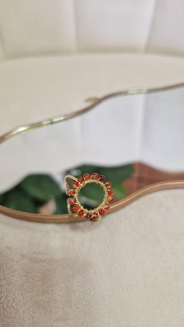 Son cercle doré, habillé de petites perles rouges et orangées, évoque le soleil couchant et les teintes naturelles de l’automne.