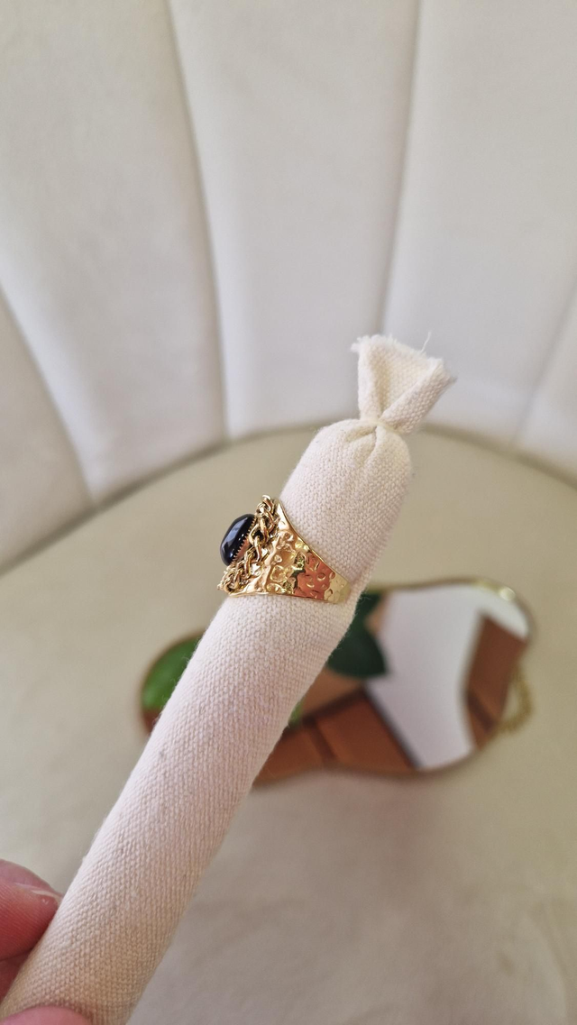 Ajoute une touche de caractère à ton look avec cette bague dorée au design unique. Son anneau martelé et sa finition chaîne entourant une pierre noire en font une pièce forte et élégante, parfaite pour accessoiriser toutes tes tenues.