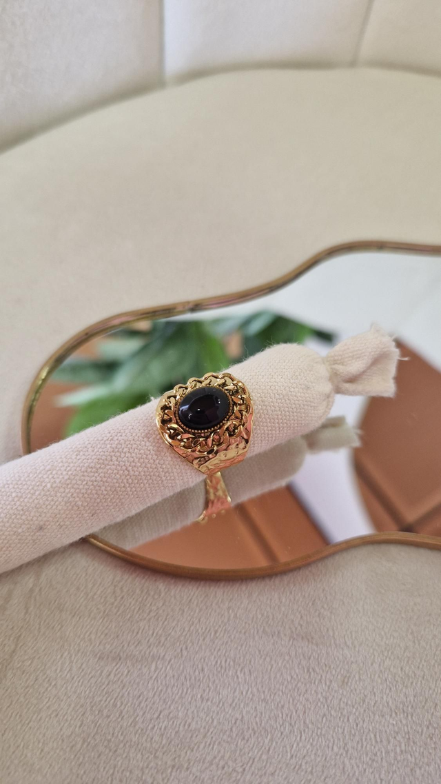 bague chaîne dorée, bague pierre noire, bague femme acier inoxydable, bague dorée ajustable, bague tendance 2025, bijou fantaisie doré femme