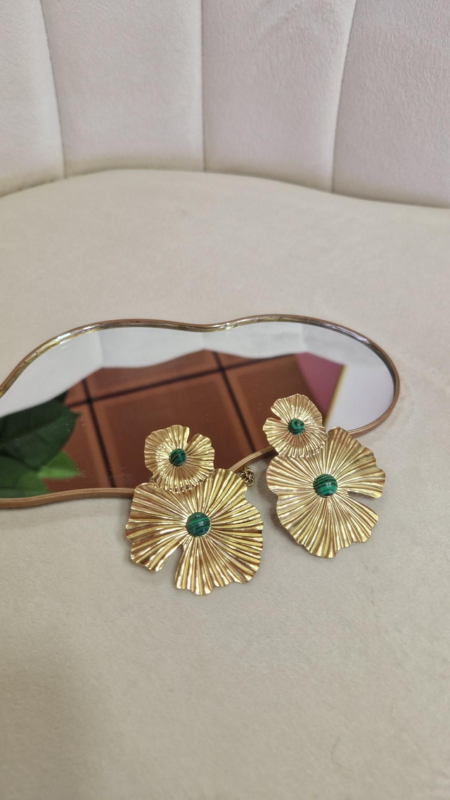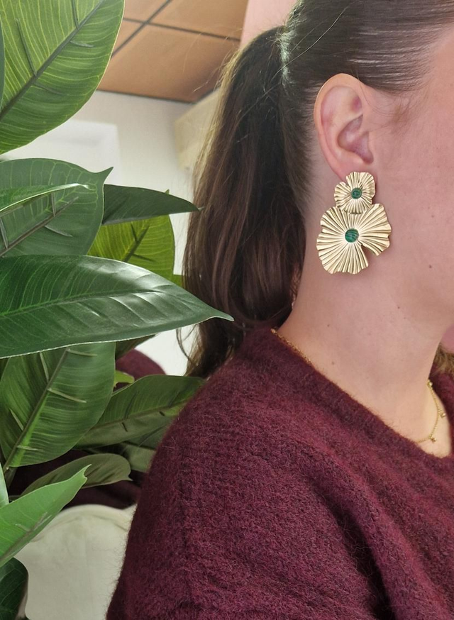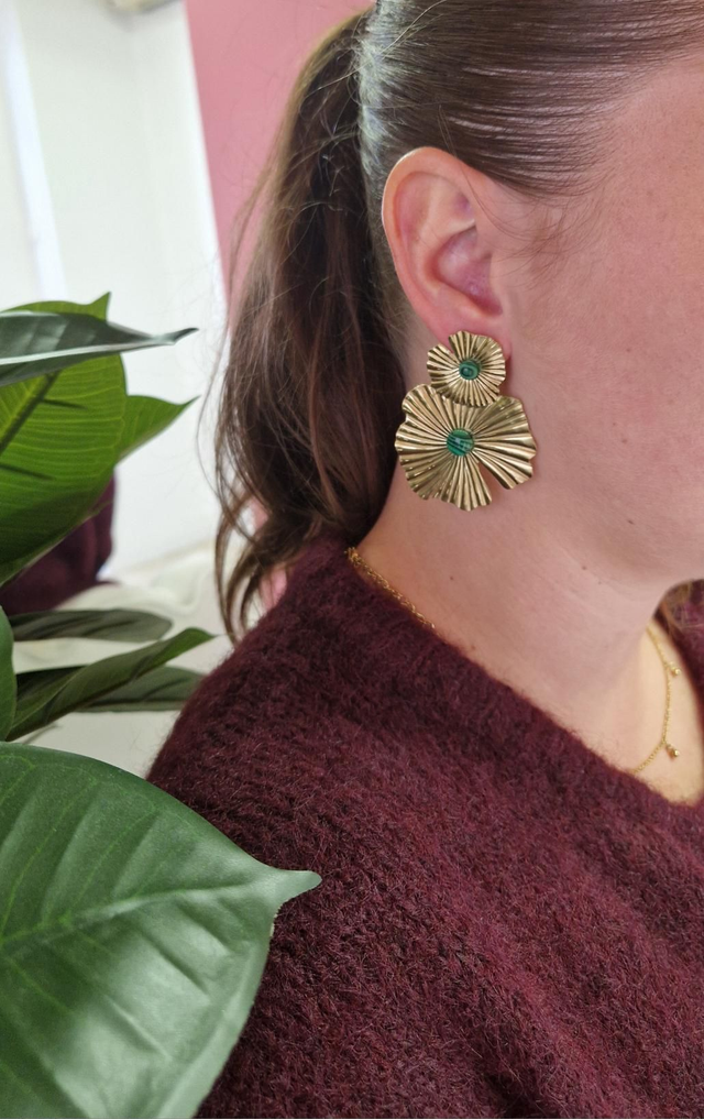Avec leur forme florale plissée dorée et leur pierre verte effet malachite au centre, elles allient finesse et audace dans un style résolument chic et intemporel.