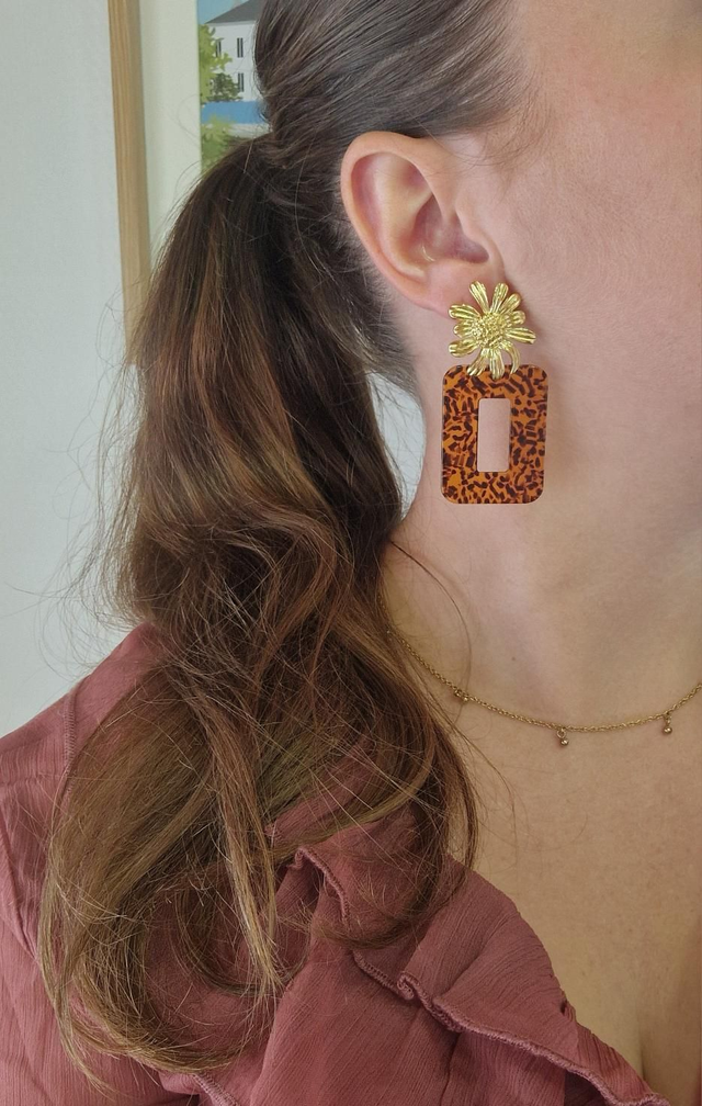 boucles d’oreilles fleur dorée, boucles écaille tendance, boucles fantaisie acier inoxydable, bijoux femme originaux, boucles rétro modernes, boucles léopard