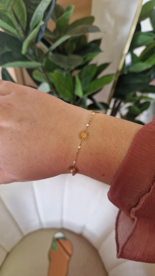 Le bracelet Solène en acier inoxydable doré se distingue par sa finesse et sa luminosité. Ses petites perles blanches associées aux étoiles dorées apportent une touche délicate et féminine, parfaite pour sublimer vos tenues avec élégance. Un indispensable de la boîte à bijoux !