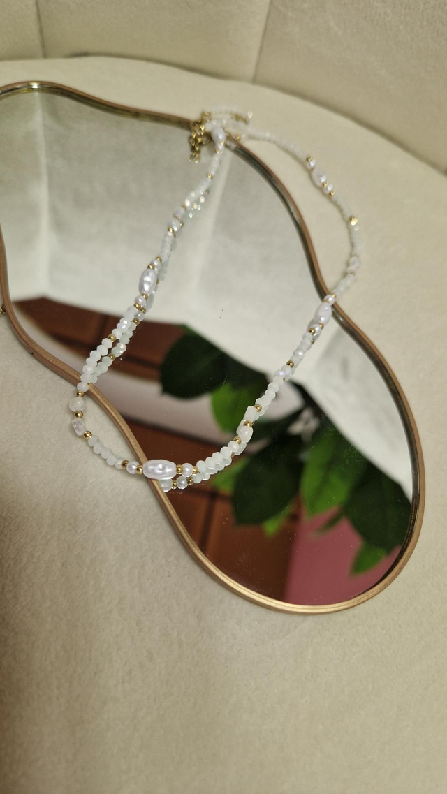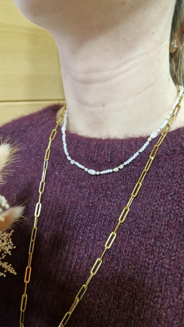 Composé de perles blanches associées à de petites perles dorées, il apporte une touche lumineuse et raffinée à votre cou.