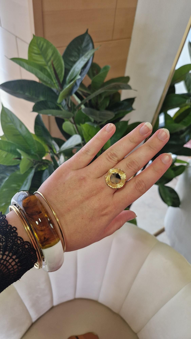 Craquez pour cette bague dorée au design solaire et raffiné. Son anneau fin met en valeur un cabochon rond entouré d’un motif gravé en forme de rayon, qui capte la lumière et attire le regard.