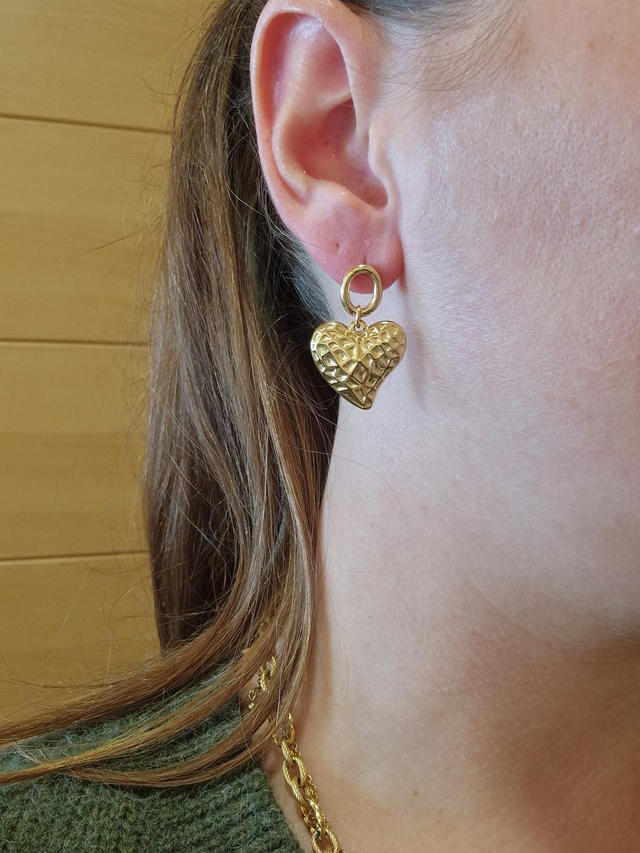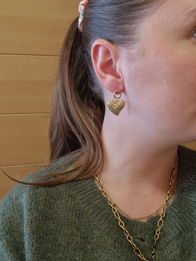 Apportez une touche de romantisme et d’élégance à vos tenues avec les boucles d’oreilles Amalia. Leur pendentif en forme de cœur doré à l’effet martelé capte la lumière à chaque mouvement.