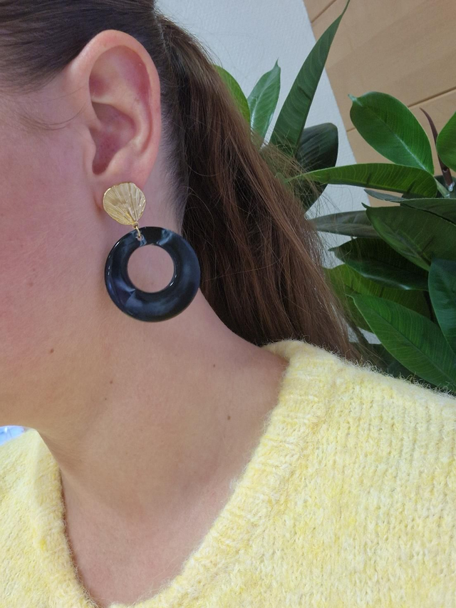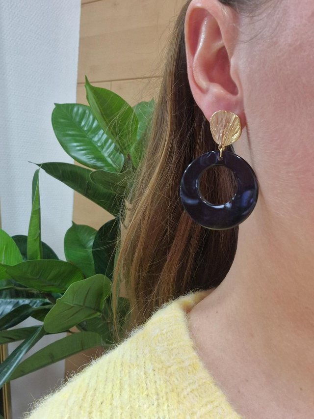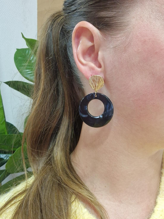 Leur détail raffiné : une puce dorée en forme de pétale texturé qui capte la lumière, associée à un cercle noir effet résine ultra-léger. Résultat : une paire de boucles d’oreilles au style bohème-chic, qui ne passera jamais inaperçue.