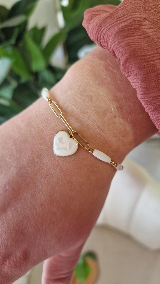 bracelet cœur nacré, bracelet femme romantique, bracelet doré avec perles, bijou cadeau femme, bracelet tendance élégant 2025.